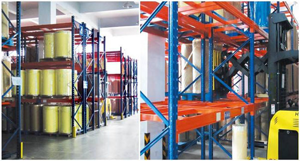 普通叉車搭配:一整棟式貨架,沒(méi)有專門的叉車通道,由叉車駛?cè)胴浖軆?nèi)部存取貨物。