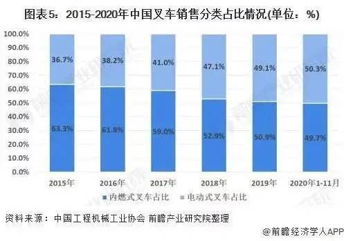 2020年1-11月份的累計銷量達到72.56萬輛,與2019年同期相比增長30.3%,其中電動式叉車銷量占比達到50.3%,比2019年增長1.2個百分點,主要是受環(huán)保要求和室內作業(yè)環(huán)境要求的驅動,電動叉車需求持續(xù)增長。